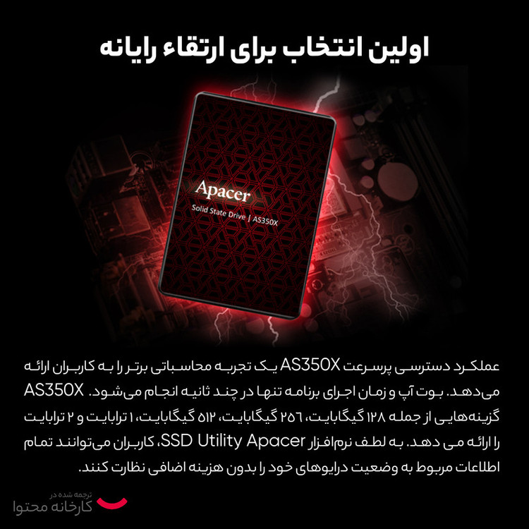 حافظه SSD مدل AS350X SATA III جدیدترین SSD کمپانی Apacer است. این محصول از نسل جدیدی از رابط SATA III استفاده میکند و سرعت انتقال تا 6 گیگابیت بر ثانیه را فراهم میسازد و موجب خواهد شد تا سرعت خواندن/نوشتن تا 560/540 مگابایت بر ثانیه برسد.دسترسی با سرعت بالا یک تجربه محاسباتی برتر را به کاربران حافظه SSD مدل AS350X SATA III ارائه میدهد. بوت آپ و زمان اجرای برنامه تنها در چند ثانیه انجام میشود. AS350X در ظرفیتهای 128 گیگابایت، 256 گیگابایت، 512 گیگابایت و 1 ترابایت موجود است. به لطف نرم افزار SSD Utility Apacer، کاربران میتوانند تمام اطلاعات مربوط به وضعیت درایوهای خود را بدون هزینه اضافی نظارت کنند.حافظهی AS350X دارای طول عمر طولانی با پایداری عملکرد بهبود یافته است و این عملکرد ثابت را حتی پس از سالها استفاده حفظ میکند.