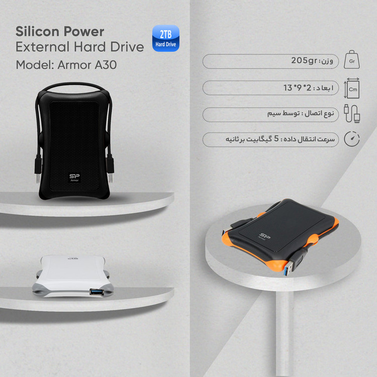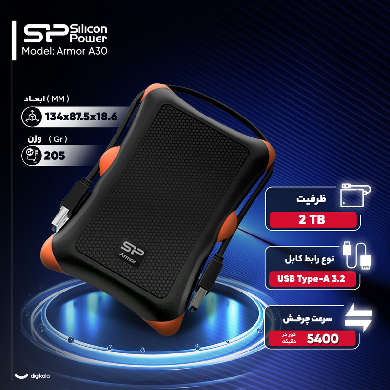 هارد اکسترنال سیلیکون پاور مدل Armor A30 ظرفیت 2 ترابایت دارای رابط USB Type-A