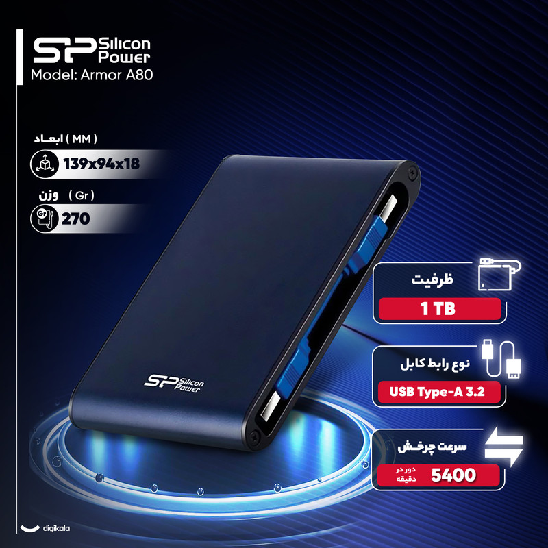 شرکت «سیلیکون پاور» (Silicon Power) این سری از هارددیسکهای اکسترنال خود را با نام آرمور (Armor) به معنای زره یا ضدگلوله به بازار ارائه کرده است. البته این نامگذاری بیدلیل نبوده، زیرا این سری از هارددیسکها که A80 هم عضو آنهاست، در برابر آب، ضربه، گرد و خاک، فشار و لرزش مقاوم هستند و این خاصیتها در آزمایشهای مختلف سیلیکونپاور به اثبات رسیده است. نام انتخابشده برای این سری از هارددیسکها هم به همین دلیل است. این هارددیسک اکسترنال 1ترابایتی از رابط پرسرعت USB 3.0 (USB 3.2 Gen 1) بهره میبرد و در عین حال با رابطهای قدیمیتر مانند USB 2.0 نیز سازگار است. هارددیسک A80 انرژی مورد نیاز خود را نیز از همین رابط USB تامین میکند و این کار را به صورت همزمان در حال تبادل اطلاعات انجام میدهد. این هارددیسک برای افرادی که بیشتر زمان خود را در حال حرکت هستند و یا افرادی که میخواهند اطلاعات مهم خود را همیشه همراه داشته باشند و نمیخواهند نگران ازبینرفتن اطلاعات بر اثر آسیب و خطرات ناگهانی باشند، بسیار مناسب است.