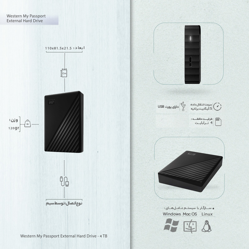 هارد اکسترنال وسترن دیجیتال مدل My Passport ظرفیت چهار ترابایت دارای رابط USB Type-A 3.0