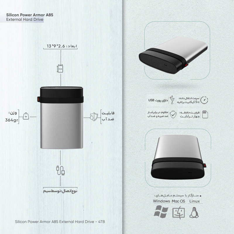 شرکت تایوانی «سیلیکونپاور» (Silicon Power) پس از تولید موفق چندین مدل از هارددیسکهای اکسترنال سری آرمور (Armor)، اینبار Armor A85 را ارائه کرده است. در بدنهی آرمور A85 از آلومینیوم استحکامیافته استفاده شده است که هم به زیبایی این محصول کمک میکند و هم مقاومت آن را کمی افزایش میدهد. البته آرمور A85 برای حفاظت از اطلاعات، کمتر به این پوشش آلومینیومی وابسته است و با سه لایهی محافظ، از هارددیسک داخلی مراقبت میکند. این سه لایه با ایجاد یک لایه بالشتکی، ضربههای وارده را جذب کرده و در جهت خنثیکردن آنها میکوشد. نقش این لایهها دقیقا مشابه سیستم تعلیق و فنربندی خودروست که با ایجاد لایهای فنری، مانع آسیبرسیدن به هارددیسک میشوند. به لطف این سازوکار محافظتی، آرمور A85 میتواند وزنی 500 کیلوگرمی را بهراحتی روی خود تحمل کند و آسیبی به آن وارد نشود. ضدضربه، ضدشوک و ضدآب بودن از دیگر ویژگیهای این محصول سیلیکونپاور است؛ بهاینترتیب آرمور A85 دارای گواهینامه IP68 هم است. شرکت سازنده این هارددیسک برای امنیت اطلاعات کپیشده درون آن، نرمافزار رایگان SP HDD Lock را ارائه کرده است که به کمک آن میتوانید بهسادگی روی دادهها، رمز بگذارید تا کسی نتواند به اطلاعات شخصی شما دسترسی داشته باشد.