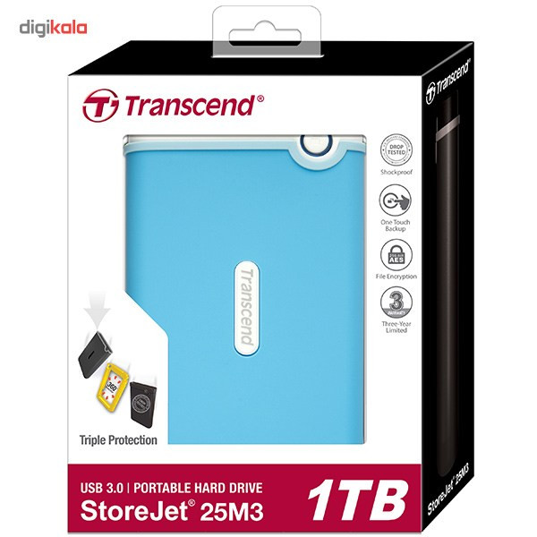 هارددیسک اکسترنال «StoreJet 25M3» یک محصول کوچک و قابلحمل است که نام برند «ترنسند» (Transcend) را بر خود دارد. StoreJet 25M3 محصولی مناسب برای ذخیرهسازی فایلهای حجیم، بکاپگیری و انتقال فایل است و ظاهری معمولی دارد. در این محصول از پورت SuperSpeed USB 3.0 استفاده شده که از USB 2.0 سهبرابر سریعتر است و انتقال فایل به وسیلهی آن به پروسهی سریعتر و سادهتری تبدیل میشود. این پورت با نسخهی قدیمیتر USB 2.0 هم سازگار است. همانند دیگر هارددیسکهای قابلحمل، StoreJet 25M3 هم به آداپتور مجزا نیاز ندارد و برق خود را مستقیما از پورت USB تامین میکند. برای استفاده از هارد به هیچ نرمافزار خاصی نیاز نخواهید داشت و به محض اتصال به کامپیوتر میتوان از هارد استفاده کرد. برای این هارددیسک، یک حالت ذخیرهی انرژی در نظر گرفته شده است که پس از گذشت 10 دقیقه از بی استفاده ماندن هارددیسک، حالت Sleep فعال میشود و هارد را به حالت ذخیره انرژی میبرد. این قابلیت باعث میشود تا در برق مصرفی صرفهجویی شود و عمر دستگاه افزایش یابد. بدنهی StoreJet 25M3 ضدضربه است و در آن از سه لایه پوشش محافظ استفاده شده که در حد و اندازهی استانداردهای نظامی است. پوشش بیرونی ضدلغزش است، لایهی دوم از جنس پلاستیک سخت ساخته شده تا ضربهها را جذب کند و لایهی سوم نقش دمپر یا جذبکنندهی شوک را ایفا میکند. روی بدنه، یک دکمه برای بکاپگیری تعبیه شده است که تنها با فشردن آن میتوان از اطلاعات بکاپ گرفت. این دکمه برای یکسانسازی (Sync) فایلهای درون کامپیوتر و هارددیسک هم کاربرد پیدا میکند و این عمل به واسطهی نرمافزار Transcend Elite انجام میشود. نرمافزار Transcend Elite علاوهبر مدیریت فایل، امکان رمزگذاری 256 بیتی AES را هم به کاربر میدهد. با رمزگذاری روی دادهها میتوانید دسترسی سایرین به دادههای شخصیتان را محدود کنید تا تنها خودتان بتوانید از فایلهایتان استفاده کنید.