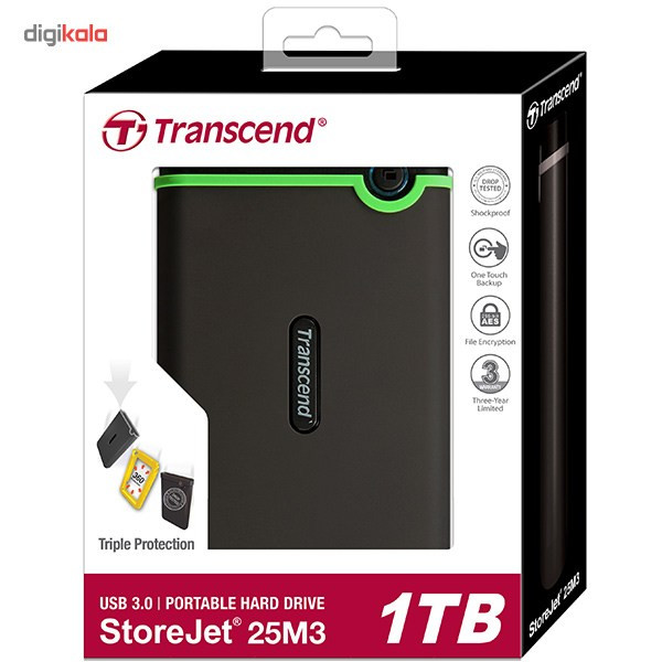 هارددیسک اکسترنال «StoreJet 25M3» یک محصول کوچک و قابلحمل است که نام برند «ترنسند» (Transcend) را بر خود دارد. StoreJet 25M3 محصولی مناسب برای ذخیرهسازی فایلهای حجیم، بکاپگیری و انتقال فایل است و ظاهری معمولی دارد. در این محصول از پورت SuperSpeed USB 3.0 استفاده شده که از USB 2.0 سهبرابر سریعتر است و انتقال فایل به وسیلهی آن به پروسهی سریعتر و سادهتری تبدیل میشود. این پورت با نسخهی قدیمیتر USB 2.0 هم سازگار است. همانند دیگر هارددیسکهای قابلحمل، StoreJet 25M3 هم به آداپتور مجزا نیاز ندارد و برق خود را مستقیما از پورت USB تامین میکند. برای استفاده از هارد به هیچ نرمافزار خاصی نیاز نخواهید داشت و به محض اتصال به کامپیوتر میتوان از هارد استفاده کرد. برای این هارددیسک، یک حالت ذخیرهی انرژی در نظر گرفته شده است که پس از گذشت 10 دقیقه از بی استفاده ماندن هارددیسک، حالت Sleep فعال میشود و هارد را به حالت ذخیره انرژی میبرد. این قابلیت باعث میشود تا در برق مصرفی صرفهجویی شود و عمر دستگاه افزایش یابد. بدنهی StoreJet 25M3 ضدضربه است و در آن از سه لایه پوشش محافظ استفاده شده که در حد و اندازهی استانداردهای نظامی است. پوشش بیرونی ضدلغزش است، لایهی دوم از جنس پلاستیک سخت ساخته شده تا ضربهها را جذب کند و لایهی سوم نقش دمپر یا جذبکنندهی شوک را ایفا میکند. روی بدنه، یک دکمه برای بکاپگیری تعبیه شده است که تنها با فشردن آن میتوان از اطلاعات بکاپ گرفت. این دکمه برای یکسانسازی (Sync) فایلهای درون کامپیوتر و هارددیسک هم کاربرد پیدا میکند و این عمل به واسطهی نرمافزار Transcend Elite انجام میشود. نرمافزار Transcend Elite علاوهبر مدیریت فایل، امکان رمزگذاری 256 بیتی AES را هم به کاربر میدهد. با رمزگذاری روی دادهها میتوانید دسترسی سایرین به دادههای شخصیتان را محدود کنید تا تنها خودتان بتوانید از فایلهایتان استفاده کنید.