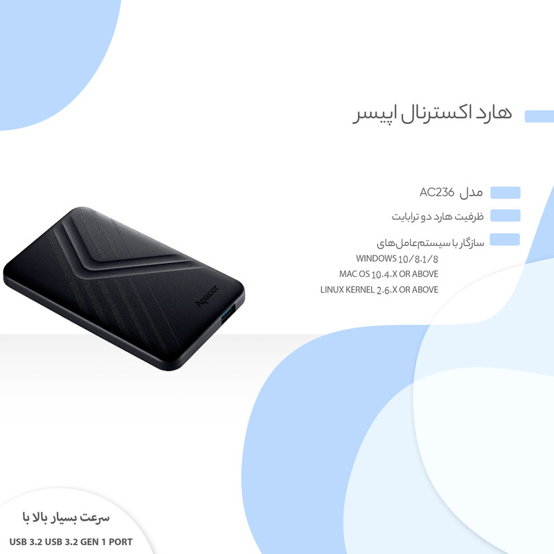 شرکت «اپیسر» محصولی را با نام هارد اکسترنال اپیسر مدل AC236 ظرفیت 2 ترابایت روانه بازار کرده است. این محصول یک هارد اکسترنال حرفهای برای ذخیرهسازی اطلاعات با سرعت زیاد است. هارد اکسترنال AC236 از طریق درگاه USB3.2 به کامپیوتر متصل میشود. درگاه USB3.2 ارائهشده روی این محصول از نوع A است و از آن میتوان روی کامپیوترهایی با درگاه USB2.0 و USB3.0 هم بهره برد. طراحی این محصول بهگونهای است که میتوان کابل اتصال را روی بدنه هارد نصب کرد تا نگرانی بابت گمشدن آن وجود نداشته باشد و از طرفی فضای بسیار کمی را اشغال کند. ویژگیای که این هارد اکسترنال را بسیار محبوب کرده وزن و ابعاد آن است که حملونقل و جابجایی را بسیار ساده کرده است. شرکت اپیسر از برندهای بزرگ تولیدکننده تجهیزات کامپیوتری است که همواره محصولاتی باکیفیت را روانهی بازار میکند.
