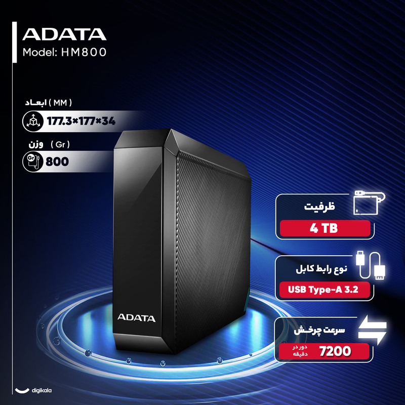 هارد اکسترنال ای دیتا مدل HM800 با ظرفیت چهار ترابایت، یک انتخاب مطمئن برای کاربرانی است که نیاز به فضای ذخیرهسازی وسیع و ایمن دارند. این هارد از نوع رومیزی طراحی شده و با وزن ۸۰۰ گرم و ابعاد متناسب، بیشتر برای استفاده ثابت در خانه یا محل کار مناسب است. استفاده از فرم فکتور ۳.۵ اینچی و سرعت چرخش ۷۲۰۰ دور در دقیقه، آن را به گزینهای قدرتمند برای ذخیرهسازی و انتقال سریع دادهها تبدیل کرده است. رابط USB 3.2 Gen 1 به کار رفته در این دستگاه سرعت انتقالی تا ۵ گیگابیت در ثانیه فراهم میکند که برای انتقال فایلهای حجیم مانند فیلمهای 4K، آرشیو بازیها یا پروژههای کاری سنگین بسیار کاربردی است.