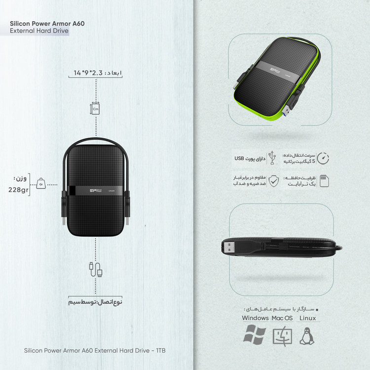 هارد اکسترنال سیلیکون پاور مدل Armor A60 ظرفیت یک ترابایت دارای رابط USB Type-A 3.2