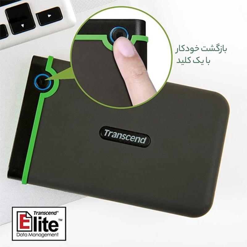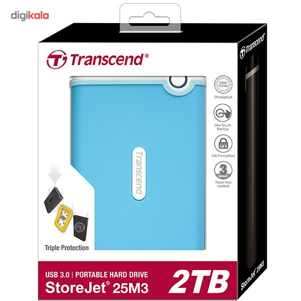 هارددیسک اکسترنال «StoreJet 25M3» یک محصول کوچک و قابل حمل است که نام برند «ترنسند» (Transcend) را بر خود دارد. StoreJet 25M3 محصولی مناسب برای ذخیرهسازی فایلهای حجیم، بکاپگیری و انتقال فایل است و ظاهری معمولی دارد. در طراحی بدنهی StoreJet 25M3 از دو رنگ آبی و مشکی استفاده شده است. در این محصول از پورت SuperSpeed USB 3.0 استفاده شده که سه برابر از USB 2.0 سریعتر است و انتقال فایل به وسیلهی آن به پروسهی سریعتر و سادهتری تبدیل میشود. این پورت با نسخهی قدیمیتر USB 2.0 هم سازگار است. همانند دیگر هارددیسکهای قابل حمل، StoreJet 25M3 هم به آداپتور مجزا نیاز ندارد و برق خود را مستقیما از پورت USB تامین میکند. برای استفاده از هارد به هیچ نرمافزار خاصی نیاز نخواهید داشت و به محض اتصال به کامپیوتر میتوان از هارد استفاده کرد. برای این هارددیسک، یک حالت ذخیرهی انرژی در نظر گرفته شده است که پس از گذشت 10 دقیقه از بی استفاده ماندن هارددیسک فعال میشود و هارد را به حالت Sleep میبرد. این قابلیت باعث میشود تا در برق مصرفی صرفهجویی شود و عمر دستگاه افزایش یابد. بدنهی StoreJet 25M3 ضدضربه است و در آن از سه لایه پوشش محافظ استفاده شده که در حد و اندازهی استانداردهای نظامی است. پوشش بیرونی ضدلغزش است، لایهی دوم از جنس پلاستیک سخت ساخته شده تا ضربهها را جذب کند و لایهی سوم نقش دمپر یا جذبکنندهی شوک را ایفا میکند. روی بدنه، یک دکمه برای بکاپگیری تعبیه شده است که تنها با فشردن آن میتوان از اطلاعات بکاپ گرفت. این دکمه برای یکسانسازی (Sync) فایلهای درون کامپیوتر و هارددیسک هم کاربرد پیدا میکند و این عمل به واسطهی نرمافزار Transcend Elite انجام میشود. نرمافزار Transcend Elite علاوهبر مدیریت فایل، امکان رمزگذاری 256 بیتی AES را هم به کاربر میدهد. با رمزگذاری روی دادهها میتوانید دسترسی سایرین به دادههای شخصیتان را محدود کنید تا تنها خودتان بتوانید از فایلهایتان استفاده کنید. حتی میتوانید برای پوشهها (Folder) هم رمز عبور تعیین کنید. دکمهی بکاپ را میتوان برای وصلکردن مجدد هارددیسکی که به صورت نرمافزاری Eject شده است استفاده کرد.