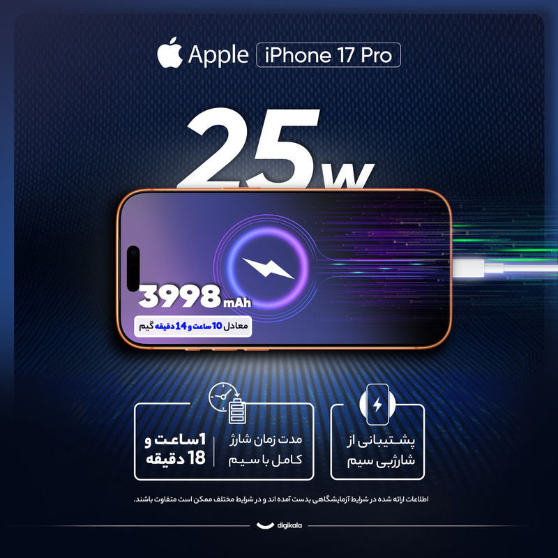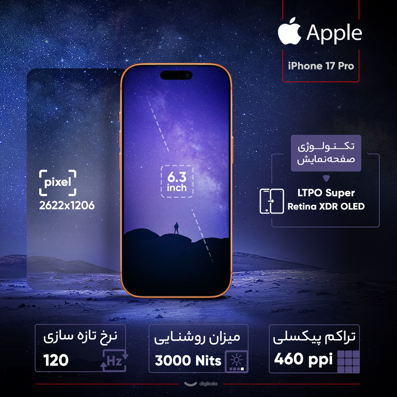 آیفون 17 پرو جدیدترین پرچمدار اپل است که با تغییرات چشمگیر در طراحی، پردازنده و دوربین معرفی شده و بار دیگر استانداردهای جدیدی برای صنعت موبایل تعیین کرده است. این گوشی با بدنهی آلومینیومی فورجشده عرضه میشود که علاوه بر استحکام بالا، توانایی دفع حرارت بهتری دارد و تجربهای پایدارتر در استفادههای سنگین ایجاد میکند. نمایشگر ۶٫۳ اینچی Super Retina XDR با فناوری OLED و نرخ نوسازی ۱۲۰ هرتزی کیفیتی خیرهکننده، رنگهای زنده و روشنایی بالا ارائه میدهد و برای کارهای حرفهای کاملاً مناسب است. قلب دستگاه تراشهی قدرتمند A19 Pro است که همراه با ۱۲ گیگابایت رم و سیستم خنککنندهی Vapor Chamber عملکردی سریع و روان در اجرای بازیها و پردازشهای سنگین دارد. حافظهی داخلی از ۲۵۶ گیگابایت تا ۱ ترابایت در دسترس است. سیستم دوربین سهگانهی ۴۸ مگاپیکسلی شامل لنز اصلی، فوق عریض و تلهفوتو با زوم اپتیکال تا ۴ برابر است و امکان ثبت تصاویر با جزئیات بالا در شرایط مختلف نوری را فراهم میکند. قابلیت فیلمبرداری 4K، ضبط همزمان از دوربین جلو و عقب و لرزشگیر بهبود یافته نیز برای تولید محتوا بسیار کاربردی است. دوربین جلوی ۱۸ مگاپیکسلی با ویژگی Center Stage تجربهای حرفهای در تماسهای تصویری و عکاسی سلفی ارائه میدهد. باتری دستگاه تا ۳۳ ساعت پخش ویدئو را پشتیبانی میکند و با شارژ سریع ۳۰ واتی تنها در ۲۰ دقیقه تا ۵۰ درصد شارژ میشود. iOS 26 با امکانات هوش مصنوعی مانند Apple Intelligence تجربهی نرمافزاری تازهای ارائه میدهد. در مقایسه با آیفون 16 پرو، مهمترین تغییرات شامل بدنهی جدید، سیستم خنککنندهی پیشرفته، ارتقای لنز تلهفوتو و Ceramic Shield نسل دوم است. در مجموع، آیفون 17 پرو ترکیبی از طراحی زیبا، قدرت سختافزاری و امکانات نرمافزاری نوین است و انتخابی مطمئن برای کاربران حرفهای به شمار میرود.