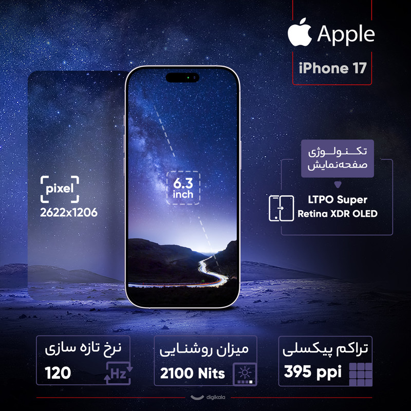 آیفون ۱۷ تازهترین پرچمدار اپل است که با ترکیب طراحی زیبا، نمایشگر ارتقایافته و سختافزار قوی، تجربهای کاملتر از همیشه را ارائه میدهد. اپل با باریکتر کردن حاشیهها، نمایشگر ۶.۳ اینچی Super Retina XDR LTPO OLED را در بدنهای جمعوجور جای داده است. این نمایشگر نرخ نوسازی تطبیقی ۱۲۰ هرتز، روشنایی خیرهکننده ۳۰۰۰ نیت و پوشش ضدانعکاس دارد و حتی در زیر نور مستقیم خورشید مشکلی برای تماشای محتوای صفحه نمایش نخواهید داشت. قابلیت Always-On Display نیز برای نخستینبار در نسخه غیر Pro در دسترس کاربران قرار گرفته است. در بخش طراحی، اپل از آلومینیوم بازیافتی و پوشش مقاوم Ceramic Shield 2 استفاده کرده که نسبت به نسل قبل سه برابر مقاومت بیشتری دارد. این گوشی در پنج رنگ جذاب عرضه میشود و با وزن مناسب، کاربری روزمره را آسان میسازد. دوربینهای دوگانه ۴۸ مگاپیکسلی آیفون ۱۷ شامل لنز عریض و فوقعریض ارتقایافتهاند که جزئیات خیرهکننده، دامنه داینامیکی وسیع و قابلیت عکاسی ماکرو را ارائه میدهند. فیلمبرداری 4K با Dolby Vision و حالتهای Cinematic و Action Mode آن را به ابزاری حرفهای برای تولید محتوا تبدیل کرده است. دوربین سلفی نیز با سنسور جدید و قابلیت Center Stage به سطحی تازه ارتقا یافته است. قلب تپنده دستگاه، تراشه ۳ نانومتری A19 است که با قدرت پردازشی بالا، پشتیبانی از Ray Tracing و رم ۸ گیگابایتی، تجربهای سریع و روان را تضمین میکند. عمر باتری تا ۳۰ ساعت پخش ویدئو ادامه دارد و با شارژ سریع، تنها در ۲۰ دقیقه به ۵۰ درصد میرسد. پشتیبانی از شارژ بیسیم MagSafe و استاندارد Qi2 هم در دسترس است. در نهایت آیفون ۱۷ انتخابی ایدهآل برای کاربرانی است که به دنبال نمایشگری درخشان، دوربینهای قدرتمند، پردازنده سریع و نرمافزاری هوشمند هستند؛ گوشیای که یکی از کاملترین پرچمداران سال ۲۰۲۵ لقب گرفته است.