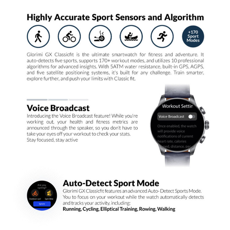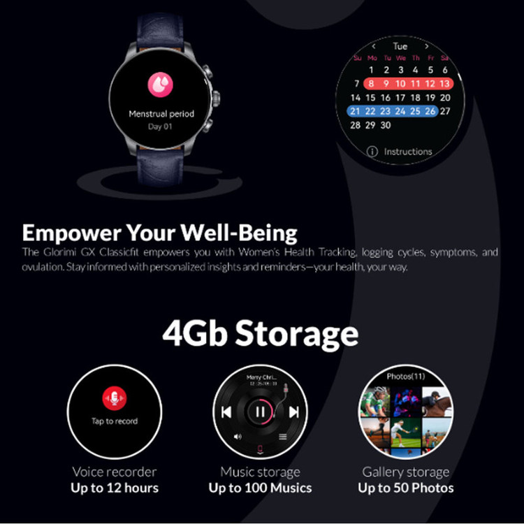 مجهز به سیستمعامل Glorimi OS / شارژدهی تا ۴۵ روز در حالت ذخیره انرژی / شارژدهی تا ۱۰ روز در استفاده عادی / مجهز به عملکرد AGPS / پشتیبانی از ۵ سیستم ماهوارهای موقعیتیابی / مقاوم در برابر آب تا عمق ۵۰ متر