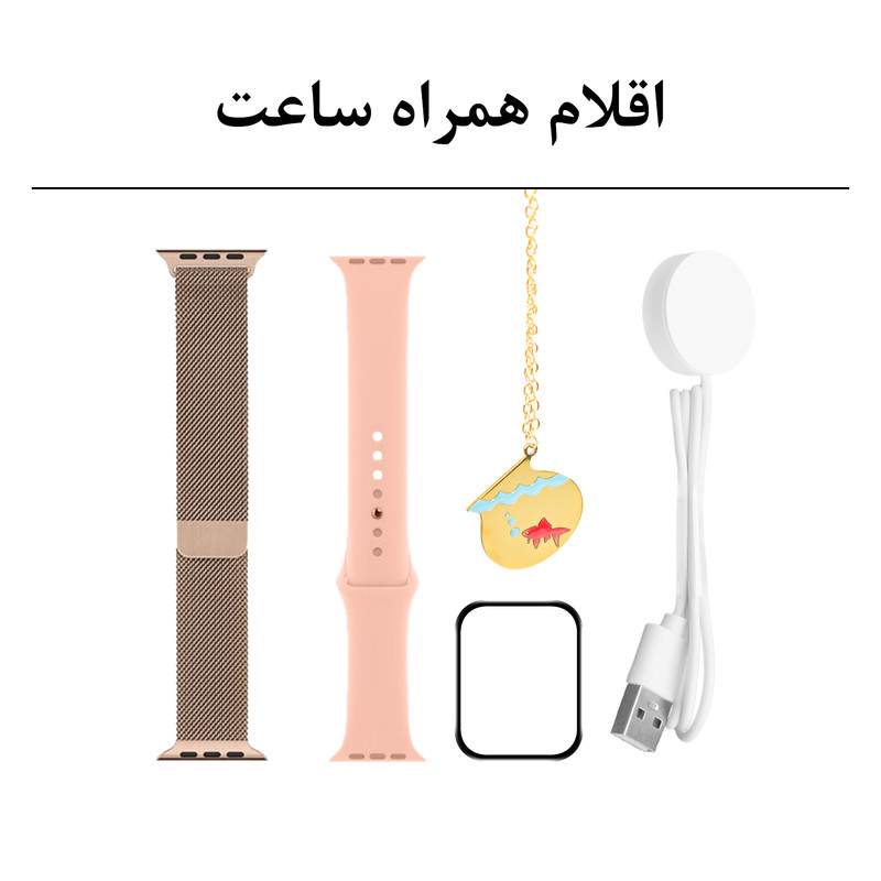 یک عدد بند فلزی میلانس - یک عدد بند سیلیکونی - محافظ صفحه نمایش - یک عدد گردنبند هدیه - شارژر ساعت هوشمند و راهنمای نصب نرم افزار به صورت فارسی