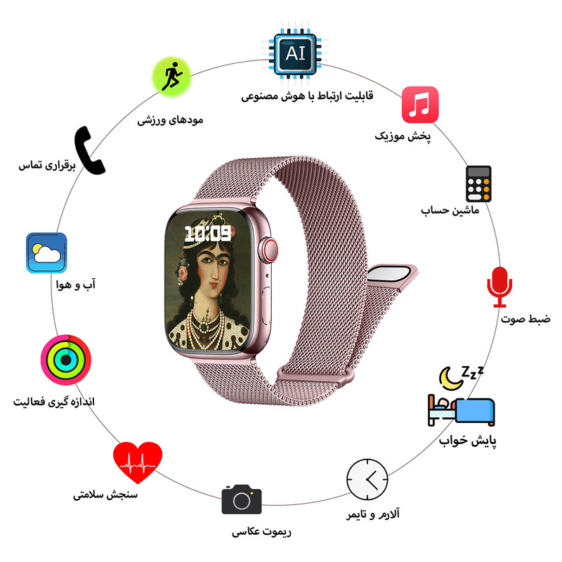 صفحه نمایش رنگی , کنترل موسیقی (Music Player) , کنترل سطح اکسیژن خون , قابلیت مکالمه از طریق بلوتوث , پشتیبانی از زبان فارسی در منو و سیستمعامل