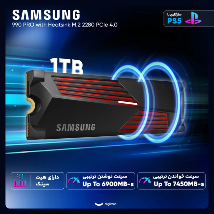 اساسدی اینترنال Samsung PRO 990 ظرفیت ۱ ترابایت با هیتسینک، یک محصول حرفهای و ویژه کاربرانی است که نهایت سرعت، دوام و پایداری را در یک ذخیرهساز مبتنی بر PCIe نسل چهارم میخواهند. این مدل با رابط PCIe Gen4 x4 و فرمفاکتور M.2 2280 طراحی شده و با ابعاد ۸۰ × ۲۲ × ۲.۳ میلیمتر و وزن تنها ۹ گرم، روی تمام مادربردهای پشتیبان این استاندارد بهراحتی نصب میشود. وجود هیتسینک داخلی یکی از مهمترین مزیتهای نسخه PRO 990 با خنککننده است، زیرا در بارهای سنگین طولانیمدت موجب پایداری حرارتی بهتر و جلوگیری از افت سرعت میشود و همین ویژگی آن را کاملاً سازگار با PlayStation 5 کرده است.