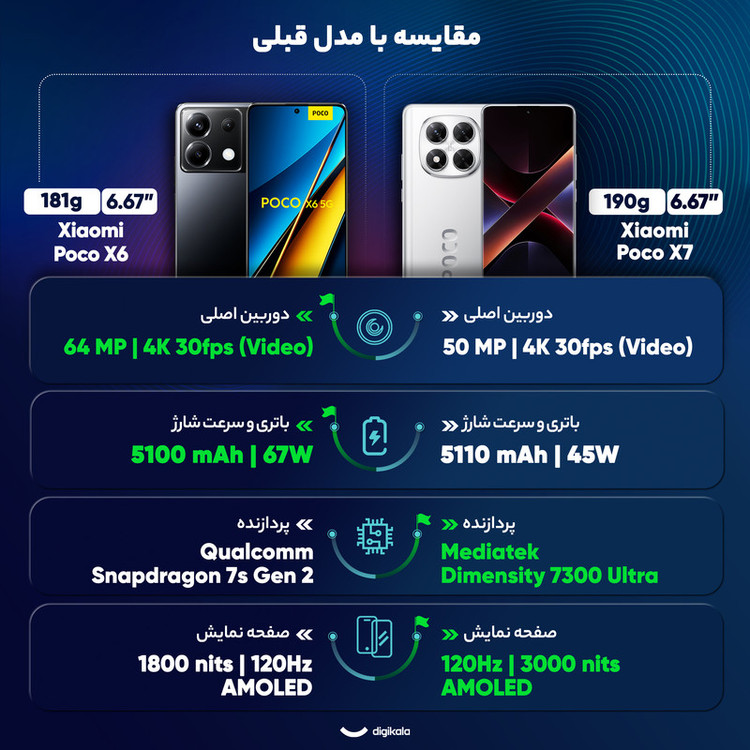 شیائومی Poco X7 در اوایل سال ۲۰۲۵ معرفی شد و بهسرعت توجه علاقهمندان به گوشیهای میانرده قدرتمند را به خود جلب کرد. این دستگاه با طراحی مدرن، قاب جلویی مجهز به شیشه Gorilla Glass Victus 2 و بدنه پشتی با دو نسخه پلاستیکی یا چرم مصنوعی، ترکیبی از زیبایی و دوام را ارائه میدهد. از طرفی مقاومت IP68 امنیت بالایی در برابر گردوغبار و آب تضمین میکند. نمایشگر ۶.۶۷ اینچی AMOLED با پشتیبانی از ۶۸ میلیارد رنگ، نرخ نوسازی ۱۲۰ هرتز، HDR10+ و دالبی ویژن، تجربه بصری شفاف و روانی فراهم میکند. روشنایی حداکثر ۳۰۰۰ نیت و رزولوشن ۱۲۲۰ در ۲۷۱۲ پیکسل، خوانایی و جزئیات بالایی را در هر شرایط نوری تضمین میکند. در بخش سختافزار، پردازنده بسیار بهینه Mediatek Dimensity 7300 Ultra با فناوری ۴ نانومتری عملکرد روانی در اجرای برنامهها و بازیها ارائه میدهد. سیستمعامل اندروید ۱۴ با رابط کاربری HyperOS، تجربهای مدرن و قابل شخصیسازی در اختیار کاربر قرار میدهد. دوربین اصلی سهگانه شامل سنسور ۵۰ مگاپیکسلی با لرزشگیر اپتیکال، سنسور فوق عریض ۸ مگاپیکسلی و ماکرو ۲ مگاپیکسلی، کیفیت مطلوبی در عکاسی و فیلمبرداری 4K ارائه میدهد. دوربین سلفی ۲۰ مگاپیکسلی نیز برای ثبت لحظات شخصی ایدهآل است. باتری ۵۱۱۰ میلیآمپرساعتی با شارژ سریع ۴۵ واتی، امکان شارژ کامل در حدود ۵۲ دقیقه را فراهم میکند. مجموعه امکانات ارتباطی ازجمله وایفای ۶، بلوتوث ۵.۴، NFC و پورت مادون قرمز، Poco X7 را به گزینهای کامل و ارزشمند در بازار میانردهها تبدیل کرده است.