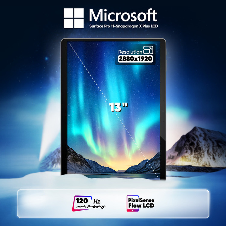 مدل Surface Pro 11‑Snapdragon X Plus LCD به نمایشگر ۱۳ اینچی PixelSense Flow LCD با رزولوشن ۲۸۸۰×۱۹۲۰ پیکسل مجهز شده است. این صفحهنمایش با نرخ نوسازی ۱۲۰ هرتز پویا، نسبت تصویر ۳:۲ و تراکم ۲۶۷ پیکسل بر اینچ، فضای دید گسترده و تجربهای روان ارائه میدهد. پشتیبانی از Dolby Vision، Dolby Vision IQ، Adaptive Color، Adaptive Contrast، پروفایلهای رنگ sRGB و Vivid و شیشه محافظ Gorilla Glass 5، کیفیت تصویر دقیق و کالیبرهشدهای را برای مدل Surface Pro 11‑Snapdragon X Plus LCD تضمین میکند.