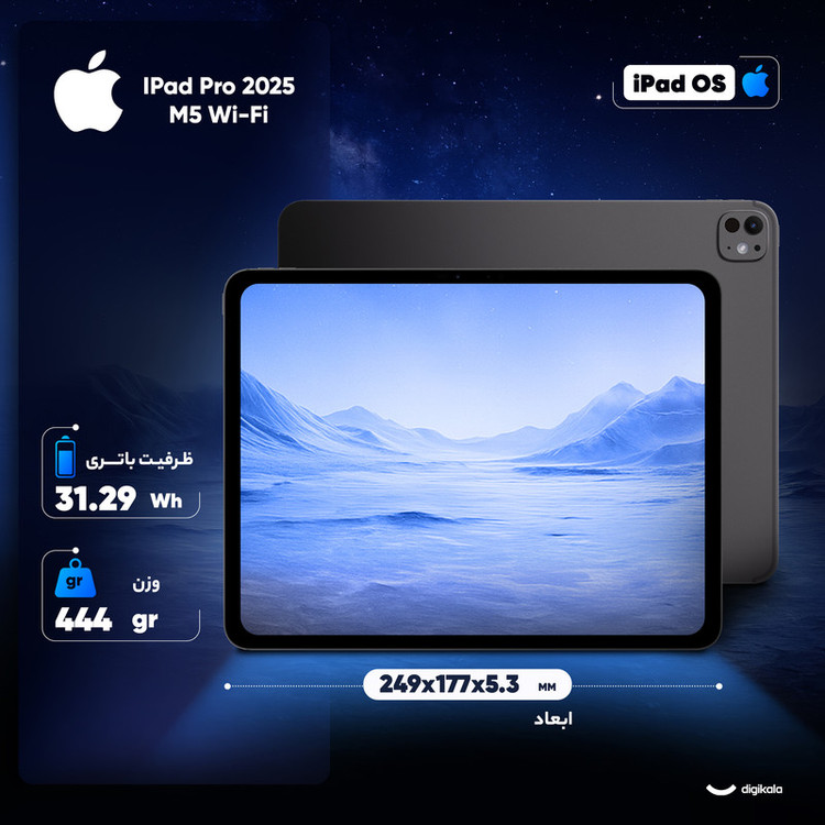 تبلت ۱۱ اینچ اپل مدل IPad Pro 2025 M5 Wi-Fi ظرفیت 512 گیگابایت و رم 12 گیگابایت، رزولوشن دوربین 12 مگاپیکسل، پشتیبانی از قلم و کیبورد